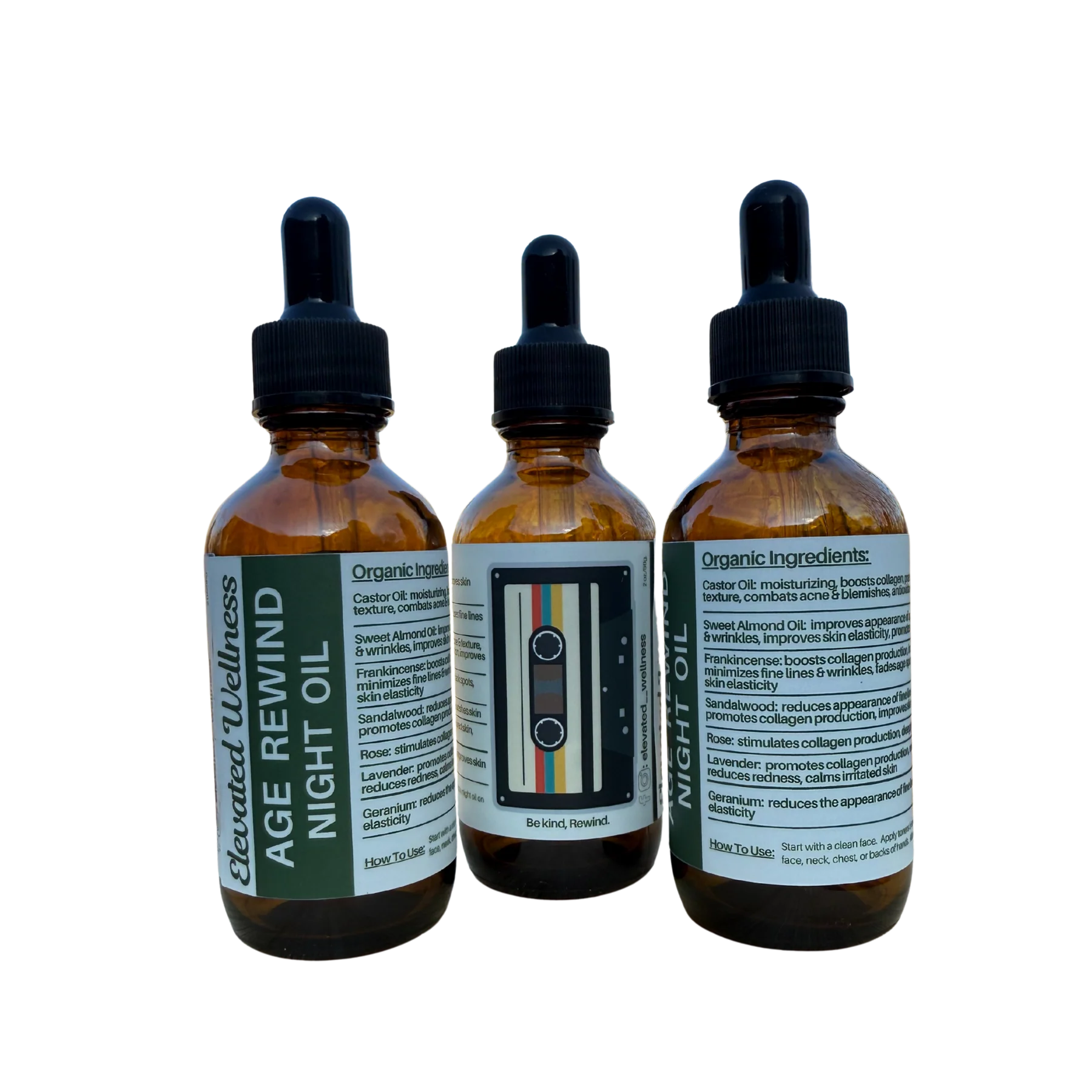 Wake up to smoother, brighter, and nourished skin with our Age Rewind Night Oil. This luxurious plant-based blend is crafted to support collagen production, soften fine lines, and deeply hydrate your skin while you sleep. This night oil is designed to restore your glow-without toxins, fillers, or synthetic fragrances. Our organic rewinding ingredients include: